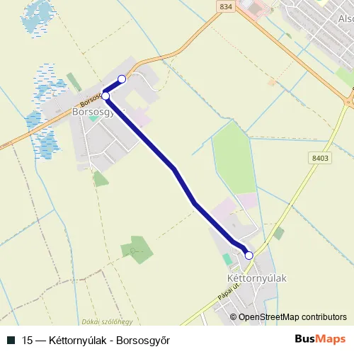 The first stop of the 15 bus route is Pápa (Kéttornyúlak), borsosgyőri elágazás and the last stop is Pápa (Borsosgyőr), autóbusz-váróterem. 15 (Kéttornyúlak - Borsosgyőr) is operational during on weekdays.