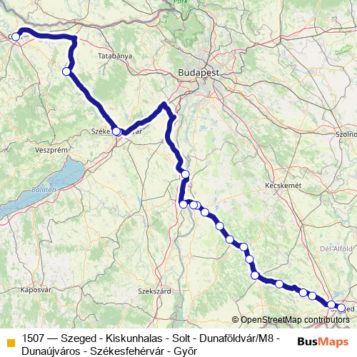 The first stop of the 1507 bus route is Szeged, autóbusz-állomás and the last stop is Győr, autóbusz-állomás. 1507 (Szeged - Kiskunhalas - Solt - Dunaföldvár/M8 - Dunaújváros - Székesfehérvár - Győr) is operational during everyday.