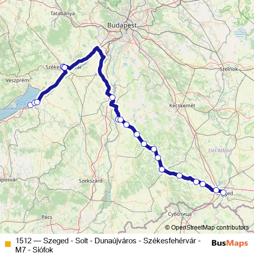 The first stop of the 1512 bus route is Siófok, autóbusz-állomás and the last stop is Szeged, autóbusz-állomás. 1512 (Szeged - Solt - Dunaújváros - Székesfehérvár - M7 - Siófok) is operational during on weekends.