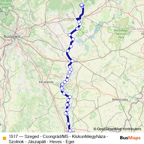 The first stop of the 1517 bus route is Szeged, autóbusz-állomás and the last stop is Eger, autóbusz-állomás. 1517 (Szeged - Csongrád/M5 - Kiskunfélegyháza - Szolnok - Jászapáti - Heves - Eger) is operational during everyday.