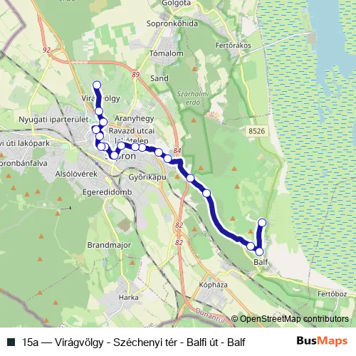 The first stop of the 15a bus route is Sopron (Balf), palackozóüzem and the last stop is Sopron, Csőszház dűlő. 15a (Virágvölgy - Széchenyi tér - Balfi út - Balf) is operational during on weekdays.
