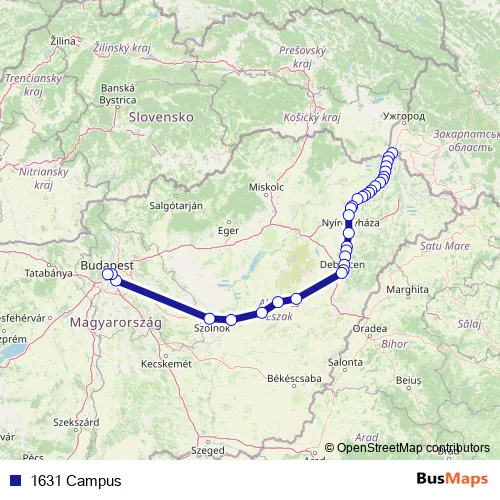 The first stop of the 1631 Campus rail route is Záhony and the last stop is Budapest-Nyugati. 1631 Campus is operational during everyday.