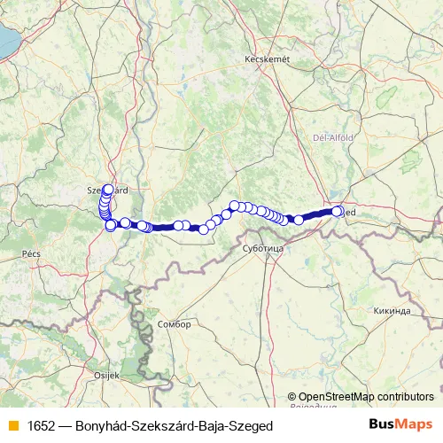 The first stop of the 1652 bus route is Szeged, autóbusz-állomás and the last stop is Szekszárd, autóbusz-állomás. 1652 (Bonyhád-Szekszárd-Baja-Szeged) is operational during everyday.
