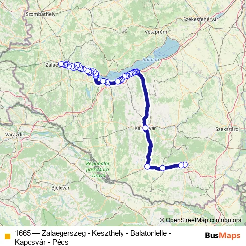 The first stop of the 1665 bus route is Pécs, autóbusz-állomás and the last stop is Zalaegerszeg, autóbusz-állomás. 1665 (Zalaegerszeg - Keszthely - Balatonlelle - Kaposvár - Pécs) is operational during everyday.
