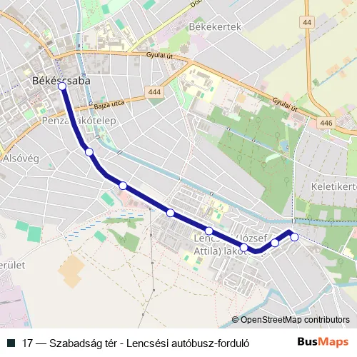 The first stop of the 17 bus route is Békéscsaba, Szabadság tér and the last stop is Békéscsaba, Lencsési autóbusz-forduló. 17 (Szabadság tér - Lencsési autóbusz-forduló) is operational during on weekdays.