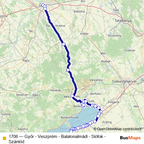 The first stop of the 1708 bus route is Győr, autóbusz-állomás and the last stop is Szántód, vasúti átjáró. 1708 (Győr - Veszprém - Balatonalmádi - Siófok - Szántód) is operational during on weekends.