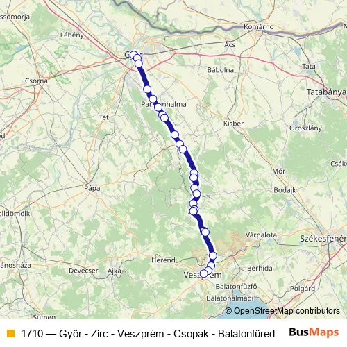 The first stop of the 1710 bus route is Győr, autóbusz-állomás and the last stop is Veszprém, autóbusz-állomás. 1710 (Győr - Zirc - Veszprém - Csopak - Balatonfüred) is operational during everyday.