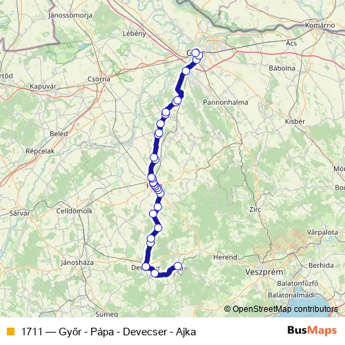 Bus 1711 - Győr - Pápa - Devecser - Ajka in Papa: Stops & Timetable