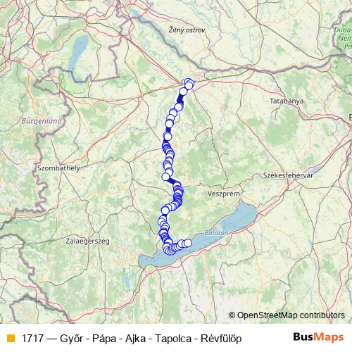 The first stop of the 1717 bus route is Győr, autóbusz-állomás and the last stop is Révfülöp, vasútállomás. 1717 (Győr - Pápa - Ajka - Tapolca - Révfülöp) is operational during everyday.