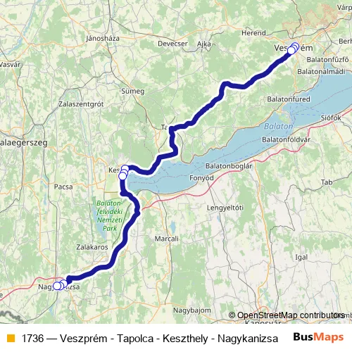 The first stop of the 1736 bus route is Veszprém, autóbusz-állomás and the last stop is Nagykanizsa, autóbusz-állomás. 1736 (Veszprém - Tapolca - Keszthely - Nagykanizsa) is operational during everyday.