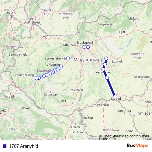 The first stop of the 1787 Aranyhíd rail route is Szeged and the last stop is Balatonszentgyörgy. 1787 Aranyhíd (1787 Aranyhíd) is operational during everyday.