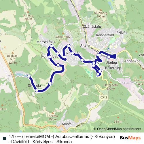 Bus 17b - (Temető/MOM -) Autóbusz-állomás (- Kökönyös) - Dávidföld - Körtvélyes - Sikonda in Pecs: Stops & Timetable