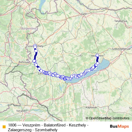 The first stop of the 1806 bus route is Szombathely, autóbusz-állomás and the last stop is Veszprém, autóbusz-állomás. 1806 (Veszprém - Balatonfüred - Keszthely - Zalaegerszeg - Szombathely) is operational during everyday.
