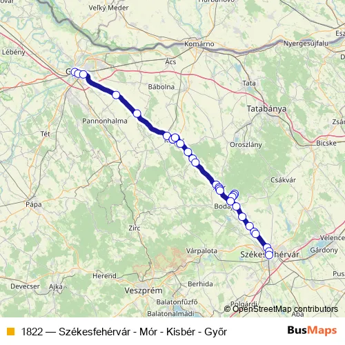 The first stop of the 1822 bus route is Győr, autóbusz-állomás and the last stop is Székesfehérvár, autóbusz-állomás. 1822 (Székesfehérvár - Mór - Kisbér - Győr) is operational during everyday.