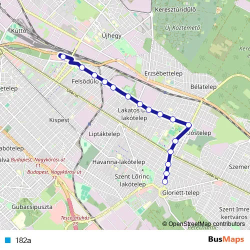 The first stop of the 182a bus route is Kőbánya-Kispest M and the last stop is Varjú utca. 182a is operational during on weekdays.