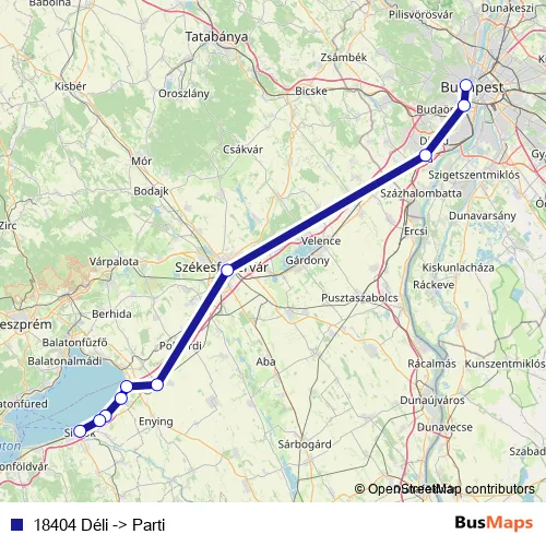 The first stop of the 18404 Déli -> Parti rail route is Budapest-Déli and the last stop is Siófok. 18404 Déli -> Parti (18404 Déli -> Parti) is operational during on weekdays.