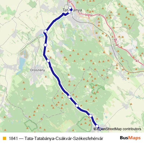 The first stop of the 1841 bus route is Csákvár, Szabadság tér and the last stop is Tatabánya, autóbusz-állomás. 1841 (Tata-Tatabánya-Csákvár-Székesfehérvár) is operational during everyday.