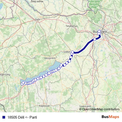 The first stop of the 18505 Déli <- Parti rail route is Balatonszentgyörgy and the last stop is Budapest-Déli. 18505 Déli <- Parti (18505 Déli <- Parti) is operational during everyday.