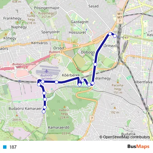 The first stop of the 187 bus route is Kamaraerdő and the last stop is Kelenföld vasútállomás M. 187 is operational during everyday.