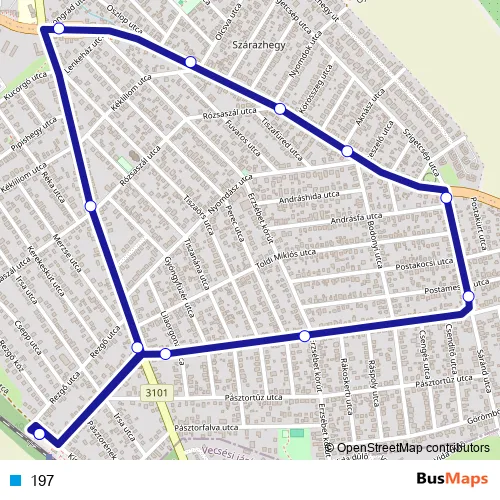 The first stop of the 197 bus route is Rákoskert vasútállomás and the last stop is Rákoskert vasútállomás. 197 is operational during on weekdays.