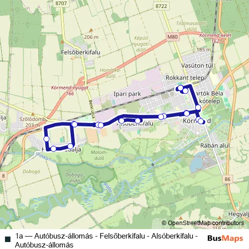 The first stop of the 1a bus route is Körmend, autóbusz-állomás and the last stop is Körmend, autóbusz-állomás. 1a (Autóbusz-állomás - Felsőberkifalu - Alsóberkifalu - Autóbusz-állomás) is operational during on weekdays.