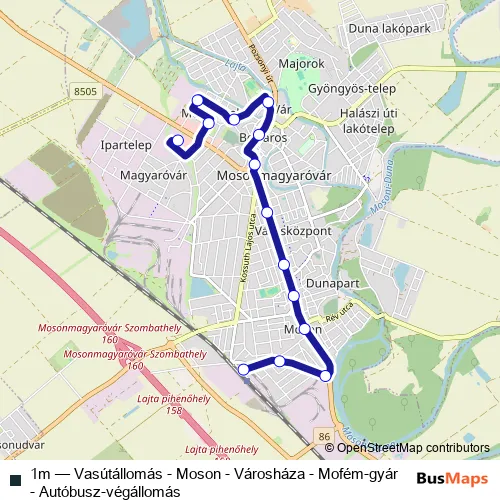 The first stop of the 1m bus route is Mosonmagyaróvár, autóbusz-végállomás and the last stop is Mosonmagyaróvár, vasútállomás. 1m (Vasútállomás - Moson - Városháza - Mofém-gyár - Autóbusz-végállomás) is operational during everyday.