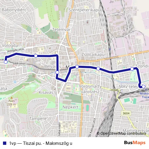 The first stop of the 1vp bus route is Malomszög utca and the last stop is Tiszai pályaudvar. 1vp (Tiszai pu. - Malomszög u) is operational during everyday.
