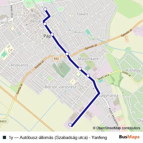 The first stop of the 1y bus route is Pápa, Yanfeng and the last stop is Pápa, autóbusz-állomás (Szabadság utca). 1y (Autóbusz-állomás (Szabadság utca) - Yanfeng) is operational during on weekdays.