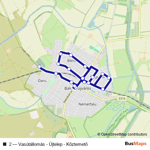 The first stop of the 2 bus route is Balmazújváros, temető and the last stop is Balmazújváros, vasútállomás. 2 (Vasútállomás - Újtelep - Köztemető) is operational during everyday.