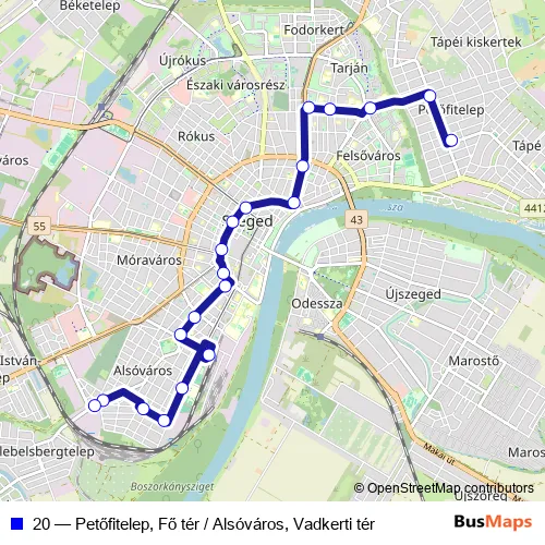 Bus 20 - Petőfitelep, Fő tér / Alsóváros, Vadkerti tér: Full Schedule in Szeged