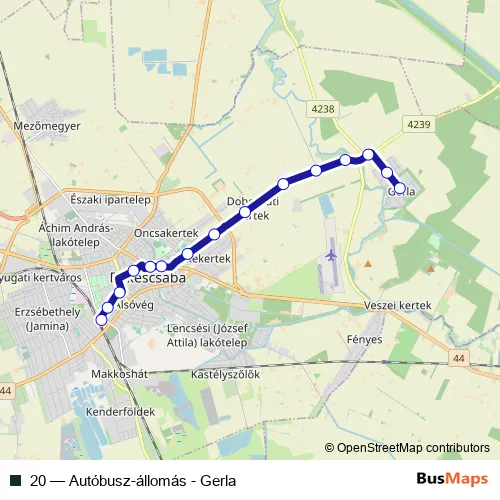 The first stop of the 20 bus route is Gerla, községháza and the last stop is Békéscsaba, autóbusz-állomás. 20 (Autóbusz-állomás - Gerla) is operational during on weekdays.