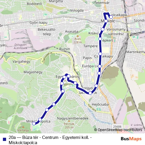 The first stop of the 20a bus route is Búza tér and the last stop is Miskolctapolca. 20a (Búza tér - Centrum - Egyetemi koll. - Miskolctapolca) is operational during on weekdays.