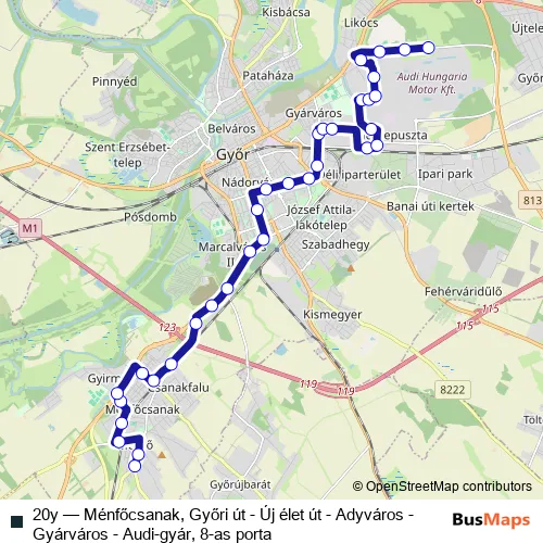 The first stop of the 20y bus route is Győr (Ménfőcsanak), Győri út, körforgalom and the last stop is Győr, Audi-gyár, 8-as porta. 20y (Ménfőcsanak, Győri út - Új élet út - Adyváros - Gyárváros - Audi-gyár, 8-as porta) is operational during on weekdays.
