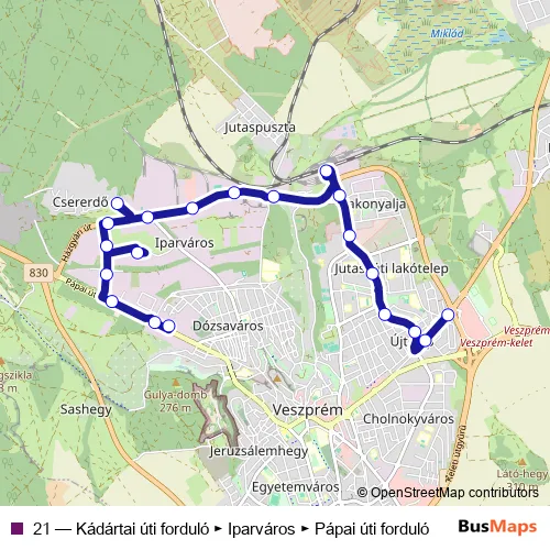 The first stop of the 21 bus route is Pápai úti forduló and the last stop is Kádártai úti forduló. 21 (Kádártai úti forduló ► Iparváros ► Pápai úti forduló) is operational during everyday.