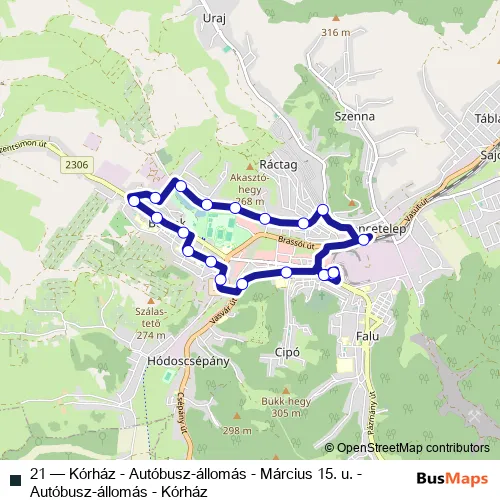 The first stop of the 21 bus route is Ózd, autóbusz-állomás and the last stop is Ózd, autóbusz-állomás. 21 (Kórház - Autóbusz-állomás - Március 15. u. - Autóbusz-állomás - Kórház) is operational during on weekdays.