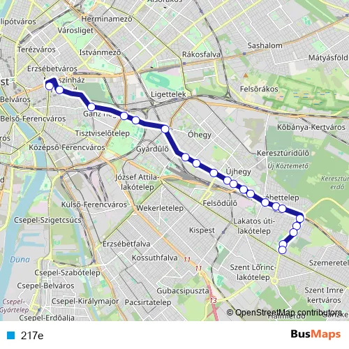 The first stop of the 217e bus route is Blaha Lujza tér M (Népszínház utca) and the last stop is Pestszentlőrinc, Szarvas csárda tér. 217e is operational during on weekdays.