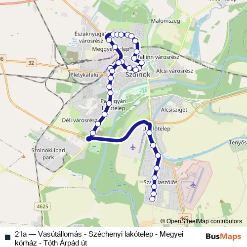 The first stop of the 21a bus route is Szolnok, vasútállomás and the last stop is Szolnok, Tóth Árpád út. 21a (Vasútállomás - Széchenyi lakótelep - Megyei kórház - Tóth Árpád út) is operational during everyday.