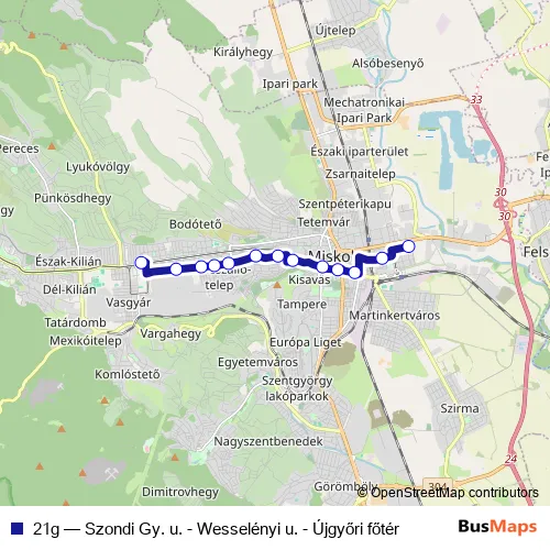 Bus 21g - Szondi Gy. u. - Wesselényi u. - Újgyőri főtér in Miskolc: Stops & Timetable
