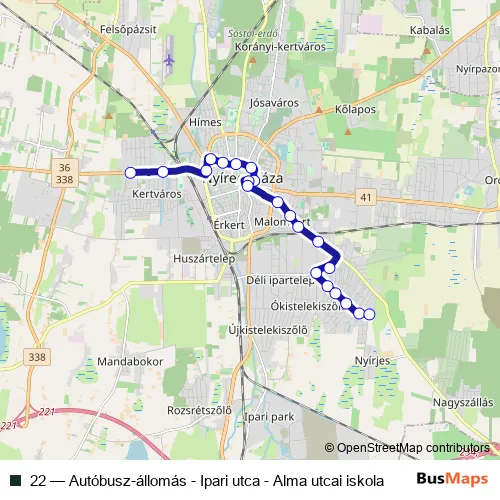 The first stop of the 22 bus route is Nyíregyháza, Szakiskola és Kollégium and the last stop is Nyíregyháza, Alma utca iskola. 22 (Autóbusz-állomás - Ipari utca - Alma utcai iskola) is operational during everyday.