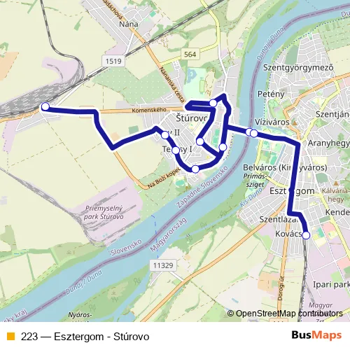 The first stop of the 223 bus route is Stúrovo, zel.st. and the last stop is Esztergom, vasútállomás. 223 (Esztergom - Stúrovo) is operational during on weekdays.