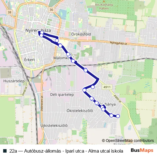 The first stop of the 22a bus route is Nyíregyháza, Kacagó utca, autóbusz-forduló and the last stop is Nyíregyháza, Kacagó utca, autóbusz-forduló. 22a (Autóbusz-állomás - Ipari utca - Alma utcai iskola) is operational during on weekdays.