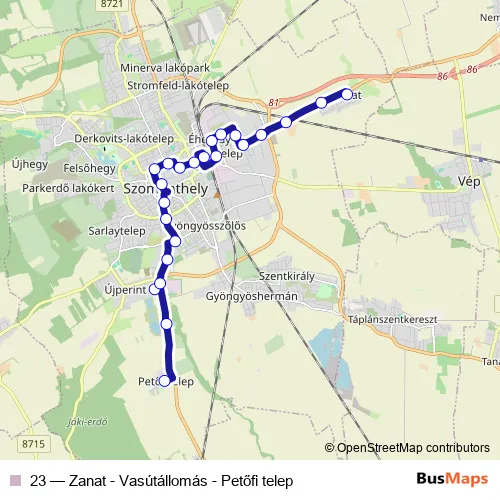 The first stop of the 23 bus route is Petőfi telep, autóbusz-forduló and the last stop is Zanat, autóbusz-forduló. 23 (Zanat - Vasútállomás - Petőfi telep) is operational during on weekdays.