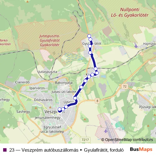 The first stop of the 23 bus route is Gyulafirátót, forduló and the last stop is Veszprém autóbuszállomás. 23 (Veszprém autóbuszállomás ► Gyulafirátót, forduló) is operational during everyday.