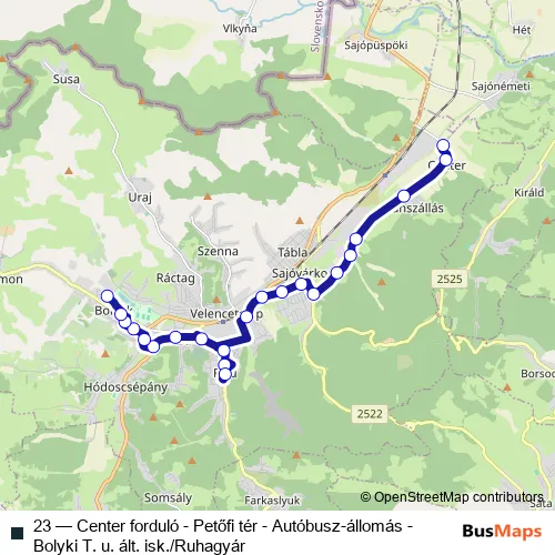 The first stop of the 23 bus route is Ózd-Center, autóbusz-forduló and the last stop is Ózd, Bolyki Tamás utca általános iskola. 23 (Center forduló - Petőfi tér - Autóbusz-állomás - Bolyki T. u. ált. isk./Ruhagyár) is operational during on weekdays.