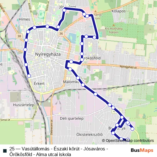 Bus 25 - Vasútállomás - Északi körút - Jósaváros - Örökösföld - Alma utcai iskola: Full Schedule in Nyiregyhaza