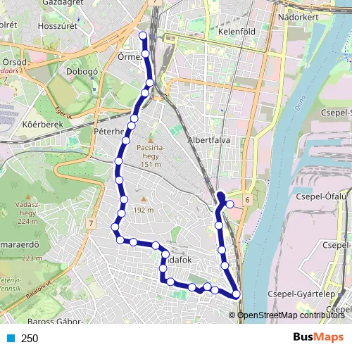 See why over 2 million users trust and consider busmaps.com as the best public transport website. busmaps gives you Budapest Buses suggested routes, real-time bus tracker, line route maps in Budapest, and helps to find the closest 250 bus stops near you. No internet available? Download an offline PDF map and bus schedule for the 250 bus to take on your trip.