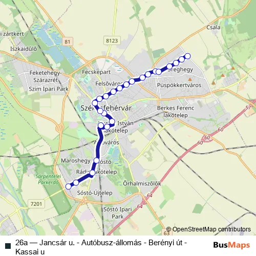 The first stop of the 26a bus route is Székesfehérvár, Orsovai utca and the last stop is Székesfehérvár, Kassai utca/Nagyszombati utca. 26a (Jancsár u. - Autóbusz-állomás - Berényi út - Kassai u) is operational during everyday.
