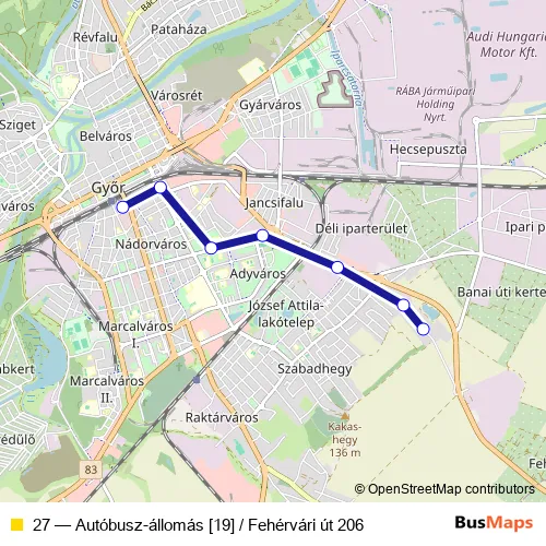 See why over 2 million users trust and consider busmaps.com as the best public transport website. busmaps gives you Gyor Buses suggested routes, real-time bus tracker, line route maps in Gyor, and helps to find the closest 27 bus stops near you. No internet available? Download an offline PDF map and bus schedule for the 27 bus to take on your trip.