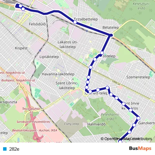 The first stop of the 282e bus route is Alacskai úti lakótelep and the last stop is Kőbánya-Kispest M. 282e is operational during on weekdays.