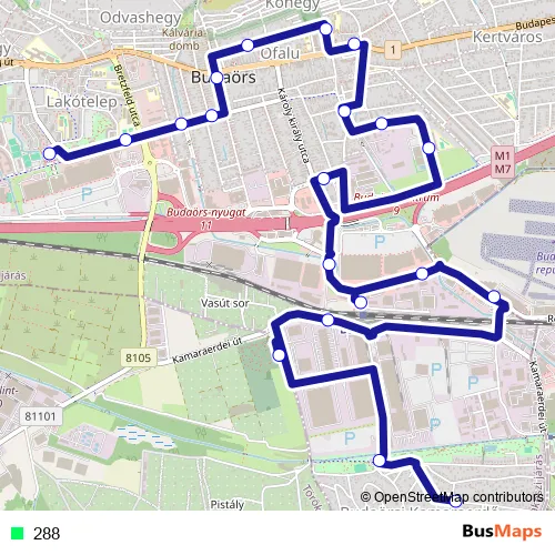 The first stop of the 288 bus route is Kamaraerdő, Iglói köz and the last stop is Budaörsi lakótelep. 288 is operational during everyday.